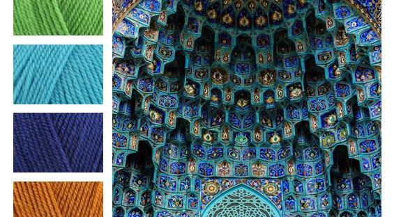 1. This is perfect! I’ve been trying to make a new colorway for my Persian Tiles pattern by Jane Crowfoot. Using this as inspiration, I think I’m going to invert her traditional colors to make teal and green the star (instead of red and orange). The only problem is, I need a 7th color — it’s only used in 2 rows (replacement for the yellow). Anyone have any suggestions?