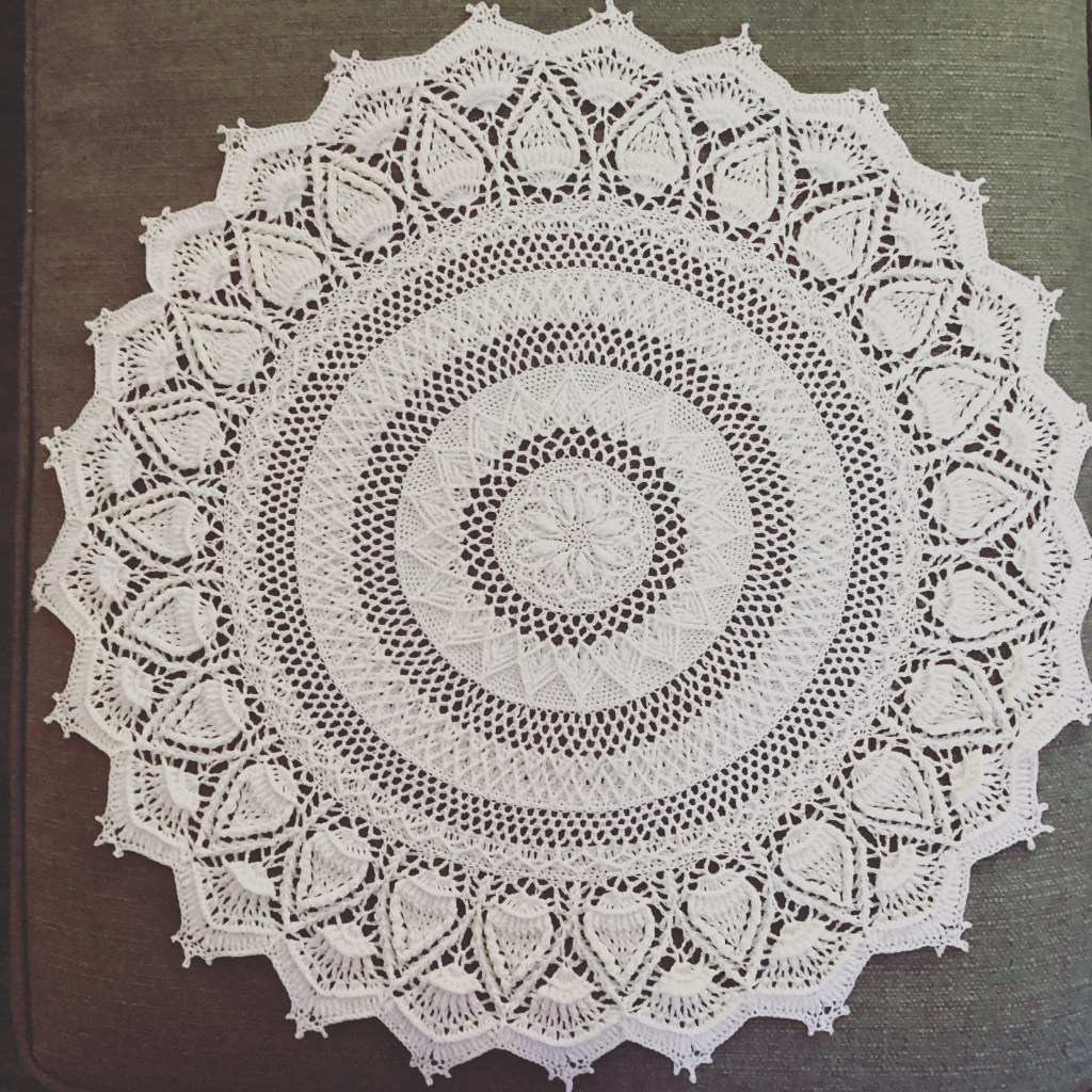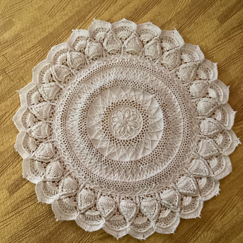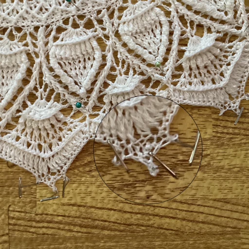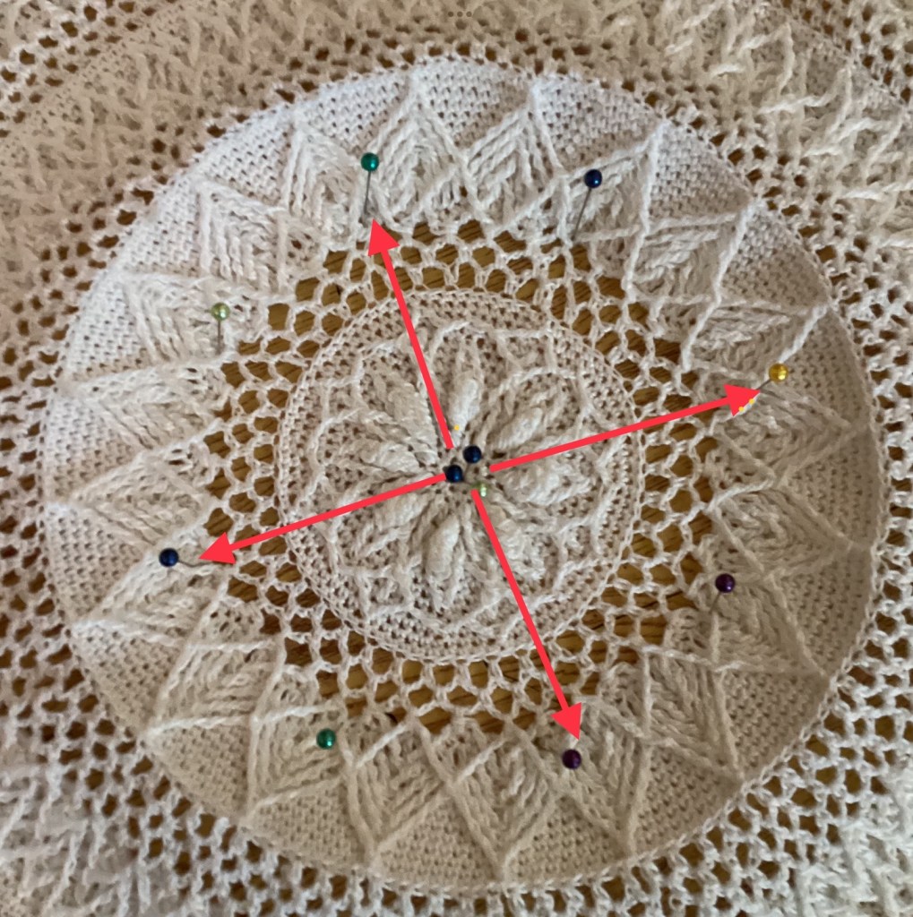 Blocking a circular project is a little different than blocking a square or rectangle project. A square project is easy to judge and measure, making sure all your side are straight and each side measures the same, where as a circular project is a little more difficult to judge.