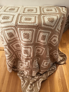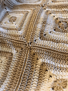 Simply Squares – Fade is prefect for beginners as its uses one of the most basic squares, The solid granny square. Seven rounds of dc’s and chain 2 corners. Using just 2 colors you can achieve an illusion of fading squares, going from dark on one end to light of the other. You can use any yarn you choose, just use the recommended hook size. I have used a #4 worsted weight yarn, remember if you choose a lighter weight you over piece will come out slightly smaller.